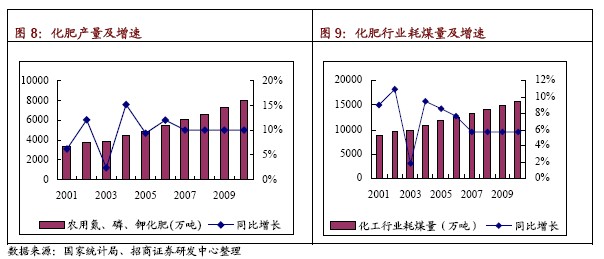 預(yù)計07 年、08 年化肥產(chǎn)量分別為6022 萬噸和6624.4 萬噸,同比分別增長10%和10%?紤]到每年4%的節(jié)能降耗,預(yù)計07 年、08 年的化肥行業(yè)煤炭消耗量為12634 萬噸和13362 萬噸,同比增長5.77%和5.77%。