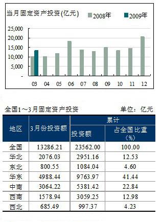 1~3月份城鎮(zhèn)固定資產(chǎn)投資累計完成額23,562億元,同比增長28.60%;其中3月份投資完成額為13286.21億元,同比增長30.31%,投資政策的拉動效應(yīng)開始顯示。