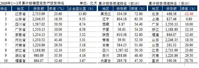 1~3月城鎮(zhèn)固定資產(chǎn)投資增速排名后10中,華東占到了5個,中南為3個,華北、西南各為1個,其中北京地區(qū)出現(xiàn)負(fù)增長(為-12.40%),固定資產(chǎn)投資大省江蘇、山東、廣東均在其中。