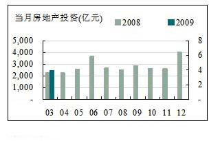 1~3月份房地產(chǎn)投資額為4880.29億元,同比增長4.10%,較2008年同期增速回落了28.2百分點,但與上月增速相比,提高3個百分點。3月份當(dāng)月完成房地產(chǎn)投資額2482.14億元,同比增長7.27%。似出現(xiàn)房地產(chǎn)回暖跡象,但仍有待時間的考證。