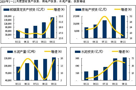 2009年1~11月,全國累計完成城鎮(zhèn)固定資產(chǎn)投資168,634.21億元,同比增長32.14%,比去年同期依然提高了5.3個百分點。
