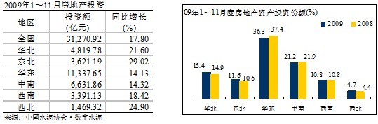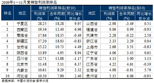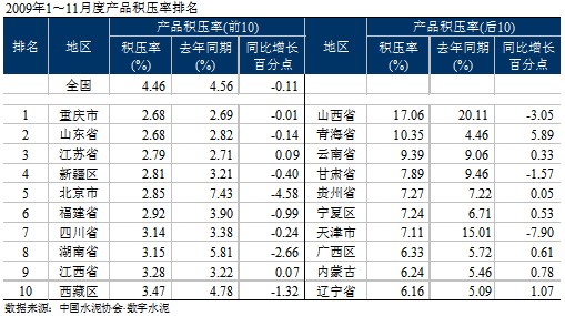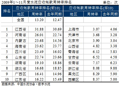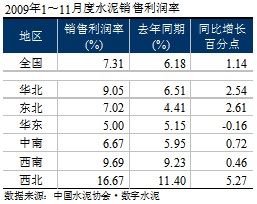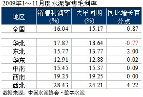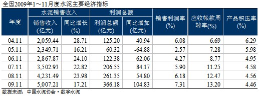 2009年1~11月,水泥市場在高需求的環(huán)境下,使得去年釋放的2億噸水泥產(chǎn)量基本消化,帶動了各項經(jīng)濟指標的提高:除銷售收入的增速低于去年外,利潤、銷售利潤率、應(yīng)收賬款周轉(zhuǎn)率、積壓率等各項指標都不同程度的優(yōu)于去年。但在各個區(qū)域之間表現(xiàn)不一,分化明顯。
