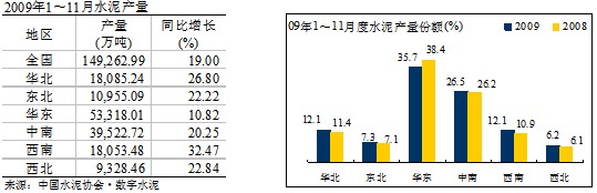 1~11月份,水泥市場逐漸見旺,產(chǎn)量以較高的速度增長,全國水泥產(chǎn)量14.93億噸,同比增長19%,增幅比去年同期提高了13.3個百分點。預(yù)計09年全年產(chǎn)量約16.4億噸,比08年約增加2.4億噸,同比增長約為17%。