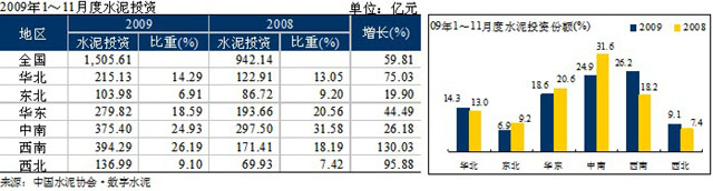 在擴內(nèi)需政策的拉動下,需求快速增長,利潤水平增長,拉動水泥投資持續(xù)火熱: 1~11月全國水泥投資1,505.61億元,同比增長59.8%,與去年同期持平,但仍處于高位增長區(qū)間。預(yù)計2009年全年水泥投資約1,650~1,700億元,投資額比2008年約增加600~650億元。