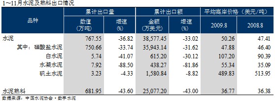 受全球金融危機的影響,2009年水泥出口依然持續(xù)下滑。1~11月水泥出口量為767.55萬噸,同比下降36.82%;水泥熟料出口量為681.95萬噸,同比下降43.60%。水泥和熟料的離岸價格都有增長,達到了每噸50.26美元和36.77美元。