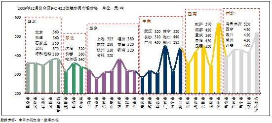 受原材料價格下降和產(chǎn)能充分釋放等因素的影響,2009年全國水泥價格平均價格較去年有所下降。截止12月,統(tǒng)計的31省市中: