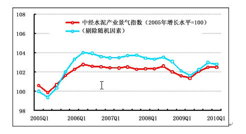 景氣:2010年一季度中經(jīng)水泥產(chǎn)業(yè)①景氣指數(shù)為102.5點(2005年增長水平=100②),比上季度上升0.5點,保持平穩(wěn)運行態(tài)勢。