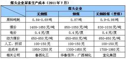 尿素本身屬于資源類產(chǎn)品,生產(chǎn)工藝分煤炭型和天燃?xì)庑蛢煞N,石油制尿素法由于其成本偏高已被業(yè)內(nèi)淘汰。尿素生產(chǎn)中,原料方面至少要占全成本的80%左右。因此,煤炭以及天然氣價(jià)格便是尿素價(jià)格的風(fēng)向標(biāo)。目前,全國有超過72%以上的尿素生產(chǎn)企業(yè)以煤為原料。所以,這部分廠家的生產(chǎn)成本可以看成業(yè)內(nèi)標(biāo)桿。下表所示為截止到2011年7月,煤頭企業(yè)的生產(chǎn)成本數(shù)據(jù)(僅供參考)。這些工廠主要分布于華北、華東以及華中地區(qū),也正好是我國尿素主產(chǎn)區(qū)。