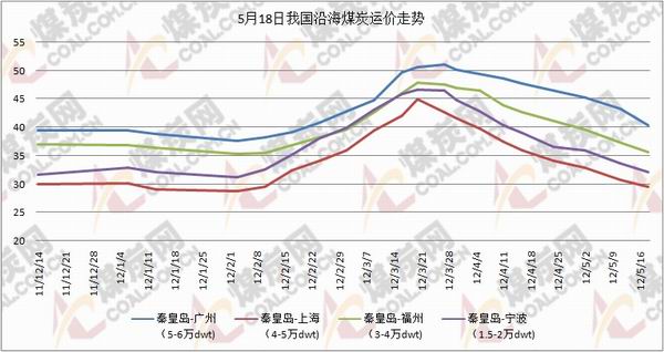 本周沿海煤炭運輸市場繼續(xù)延續(xù)弱勢下跌態(tài)勢,沿海運價已經(jīng)連續(xù)8周保持下跌。由于目前沿海六大電廠以及其他全國重點電廠的庫存仍處于高位,近期下游用煤企業(yè)派船拉煤的積極性明顯下降。近期環(huán)渤海港口等在裝運煤炭船舶數(shù)量出現(xiàn)大幅下降,港口出現(xiàn)空泊現(xiàn)象。秦皇島港等待裝船的錨地船舶數(shù)量也在90艘低位。截止到5月18日,秦皇島至廣州(5-6萬DWT)運價40.4 元/噸,較11日下降2.9元;秦皇島-福州(3-4萬DWT)運價35.6元/噸,較11日下降1.7元;秦皇島-張家港(2-3萬DWT)運價33元/噸,較11日下降1.2元;天津港-上海(2-3萬DWT)31.1元/噸,較11日下降1.2元。