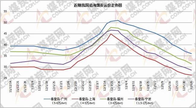 截止到6月6日,秦皇島-廣州(5-6萬DWT)運價36.1元/噸,較31日下跌1元;秦皇島-福州(3-4萬DWT)運價31.4元/噸,較上期下跌1.5元;天津-上海(2-3萬DWT)運價27.4元/噸,較上期下跌0.7元;天津-鎮(zhèn)江(1-1.5萬DWT)運價33.8元/噸,較上期下跌1元;秦皇島-寧波(1.5-2-6萬DWT)運價28.6元/噸,較上期下跌1.2元。沿海不同船型在各個航線上的煤炭運價繼續(xù)下滑,目前這一現象快連續(xù)3個月了,但是受到船舶運營成本的限制,跌幅逐漸收窄。目前國內六大電廠存煤以及存煤可用天數居高不下,下游消費企業(yè)采購積極性受挫,主要港口煤炭庫存持續(xù)增加,國際煤炭價格進一步下跌,煤炭進口量有望繼續(xù)保持高位等,這些因素無一利好沿海煤炭運輸市場。目前臨近“迎峰度夏”期,用電量會逐漸回升,在加上近期國家發(fā)布的一系列經濟刺激政策,以及船舶運輸企業(yè)的成本控制等,沿海煤炭運價有望得到底部平穩(wěn)。