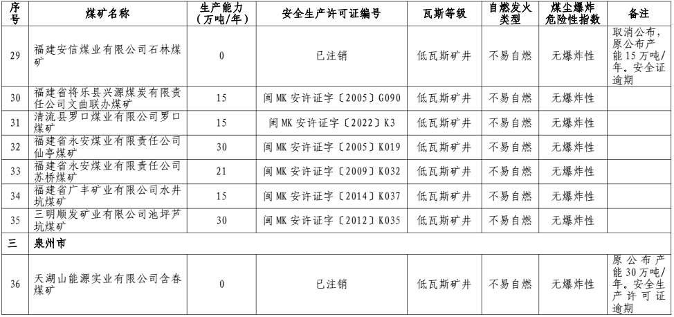 其中,龍巖市有2處,建設(shè)規(guī)模合計(jì)60萬噸/年;三明市有3處,建設(shè)規(guī)模合計(jì)75萬噸/年;泉州市有1處,建設(shè)規(guī)模15萬噸/年,據(jù)悉該煤礦已停建,由地方政府統(tǒng)籌確定關(guān)閉退出時限。詳情如下: