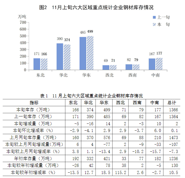 11月上旬六大地區(qū)中,東北、華北、西南地區(qū)重點(diǎn)企業(yè)鋼材庫(kù)存較上一旬有所下降,其它地區(qū)均有所增長(zhǎng)(見(jiàn)圖2、表1),具體情況為: