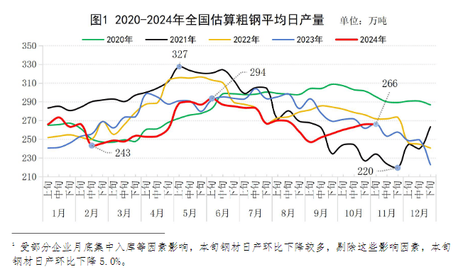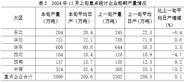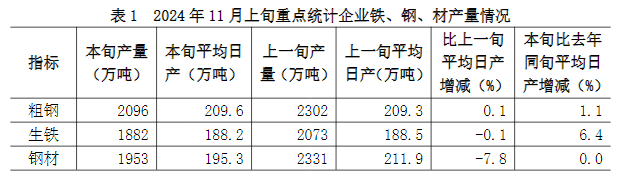 2024年11月上旬,重點(diǎn)統(tǒng)計(jì)鋼鐵企業(yè)共生產(chǎn)粗鋼2096萬噸,平均日產(chǎn)209.6萬噸,日產(chǎn)環(huán)比增長0.1%;生鐵1882萬噸,平均日產(chǎn)188.2萬噸,日產(chǎn)環(huán)比下降0.1%;鋼材1953萬噸,平均日產(chǎn)195.3萬噸,日產(chǎn)環(huán)比下降7.8%1(見表1)。