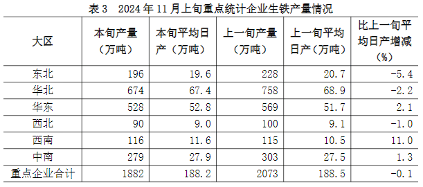 11月上旬六大地區(qū)中,華東、西南、中南地區(qū)重點(diǎn)統(tǒng)計(jì)企業(yè)生鐵日產(chǎn)量較上一旬有所增長,其它地區(qū)均有所下降(詳見表3),具體為: