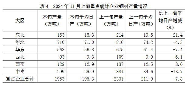 11月上旬六大地區(qū)中,除西南地區(qū)重點(diǎn)統(tǒng)計(jì)企業(yè)鋼材日產(chǎn)量較上一旬有所增長外,其它地區(qū)均有不同程度下降(詳見表4),具體為: