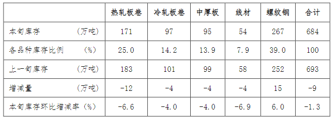 11月中旬,21個城市5大品種鋼材社會庫存684萬噸,環(huán)比減少9萬噸,下降1.3%,庫存繼續(xù)小幅下降;比年初減少45萬噸,下降6.2%;比上年同期減少89萬噸,下降11.5%。