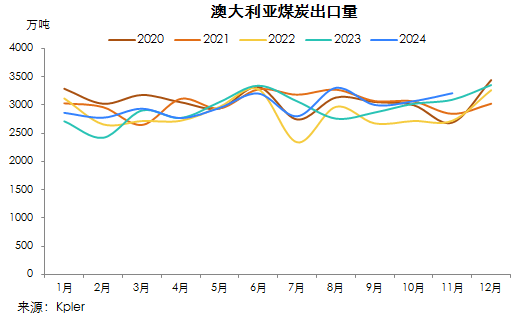 今年1-11月份,澳大利亞煤炭出口量累計3.29億噸,同比增2.71%。