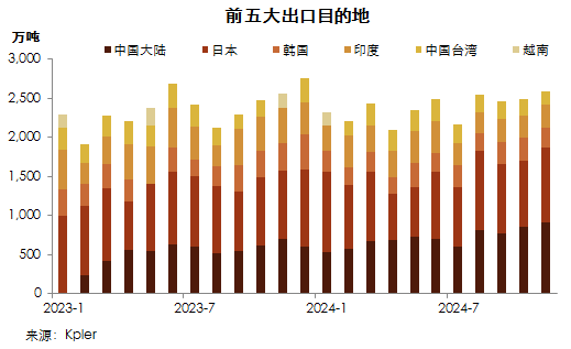 向韓國出口煤炭251.68萬噸,環(huán)比降16.84%,同比降27.38%;向中國臺灣出口157.42萬噸,環(huán)比降27.49%,同比增1.38%。