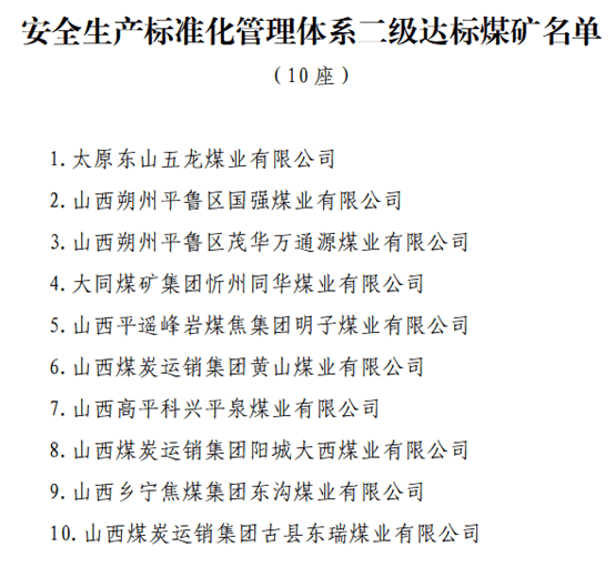 山西省應(yīng)急管理廳 山西省地方煤礦安全監(jiān)督管理局關(guān)于確認(rèn)太原東山五龍煤業(yè)有限公司等10座煤礦為安全生產(chǎn)標(biāo)準(zhǔn)化管理體系二級(jí)達(dá)標(biāo)煤礦的通知