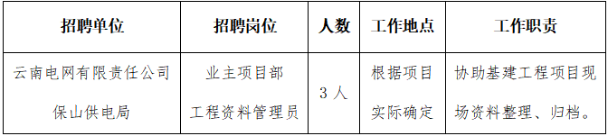 為支撐業(yè)務(wù)發(fā)展,解決臨時(shí)性、短期性人力資源緊缺問(wèn)題,依據(jù)國(guó)家法律法規(guī)及公司規(guī)章制度規(guī)定,結(jié)合保山供電局實(shí)際情況,現(xiàn)面向社會(huì)公開(kāi)招聘短期項(xiàng)目制用工3人,具體事項(xiàng)公告如下: