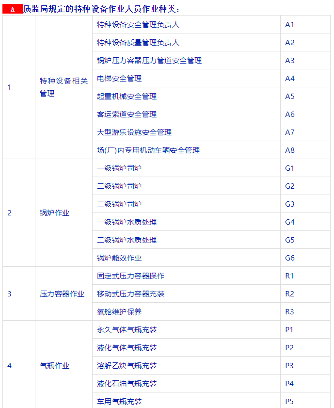 特種設(shè)備安全管理人員、叉車司機(jī)、起重機(jī)司機(jī)、起重機(jī)指揮、壓力容器、鍋爐、氣瓶充裝、電梯安裝與維修、觀光車、客運(yùn)索道操作與修理、大型游樂(lè)設(shè)施操作與維修等等。